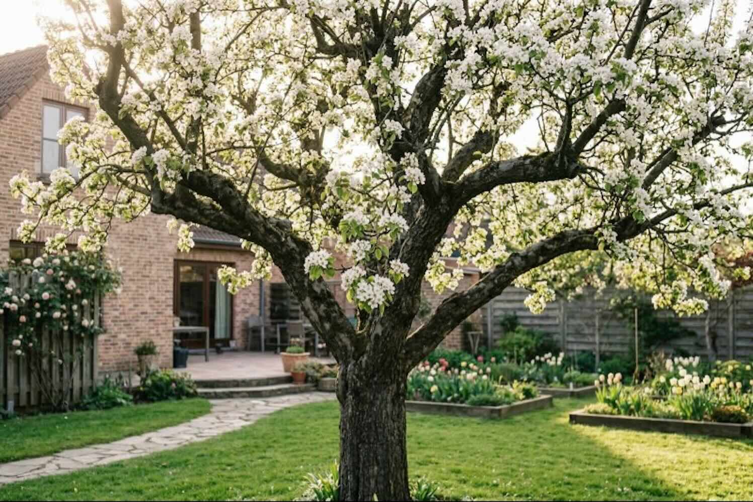 Bij de appels blijven de ecolette en de notarisappel favoriet vanwege hun robuuste groei. Echter, een zorgvuldig gekozen selectie perenbomen is minstens zo essentieel voor een authentieke sfeer. Denk aan de gieser wildeman, de onbetwiste koning onder de stoofperen, of de sappige saint rémy. Deze perenrassen bloeien vaak al vroeg in april met een uitbundige witte bloesem. Dit maakt ze tot een vitale voedselbron voor vroege bestuivers, zoals de metselbij en diverse zweefvliegen, op een moment dat er elders in de tuin vaak nog weinig te halen valt.
