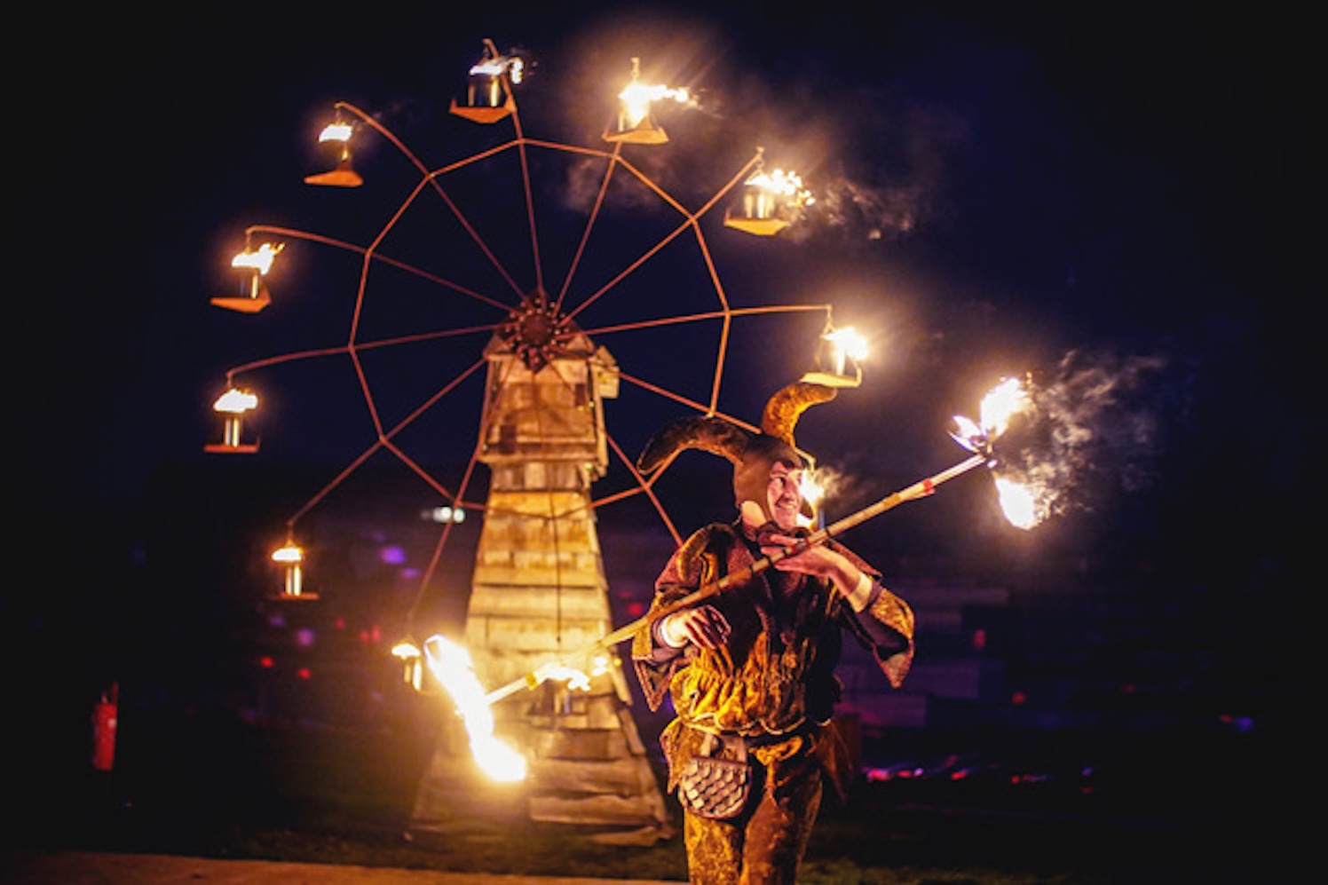 Wanneer de avond valt, kan dezelfde molen transformeren in de Vuurmolen. Met draaiende bewegingen, licht en warmte ontstaat een intiemere sfeer die refereert aan het samenkomen rond vuur. De Vuurmolen kan je eventueel combineren met een vuurperformance, waardoor de beleving verder verdiept.